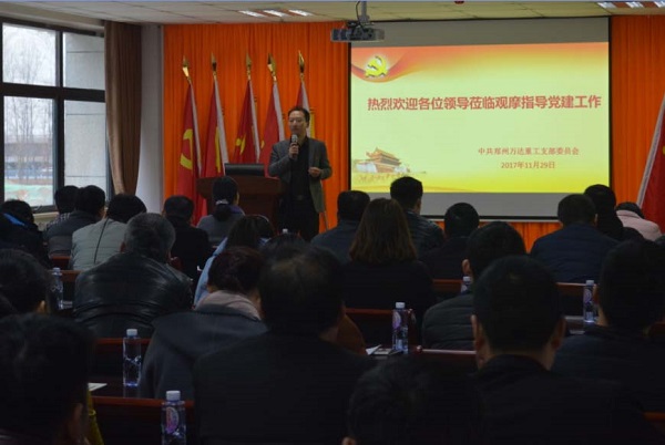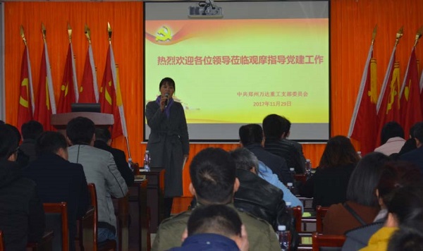 2017 年11 月29 日上午,實(shí)驗(yàn)區(qū)黨工委組織部組織區(qū)機(jī)關(guān)黨工委、各辦事處(IT 社區(qū))黨工委、興港公司黨委和港區(qū)7家非公企業(yè)黨建負(fù)責(zé)同志62 人蒞臨萬(wàn)達(dá)重工黨支部觀摩指導(dǎo)黨建工作。萬(wàn)達(dá)重工黨支部副書記于江山、紀(jì)律委員薛如勛、宣傳委員張夢(mèng)珠等人隨行陪同并講解企業(yè)運(yùn)營(yíng)、企業(yè)文化及黨建工作情況。