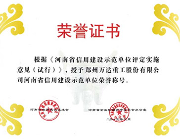 2016/01/28 558 熱烈祝賀鄭州萬達(dá)重工股份有限公司通過了河南省信用建設(shè)促進(jìn)會(huì)和河南省企業(yè)信用評(píng)審委員會(huì)辦公室共同組織的河南省信用建設(shè)示范單位復(fù)審認(rèn)證,被認(rèn)定為河南省信用建設(shè)示范單位榮譽(yù)稱號(hào)!