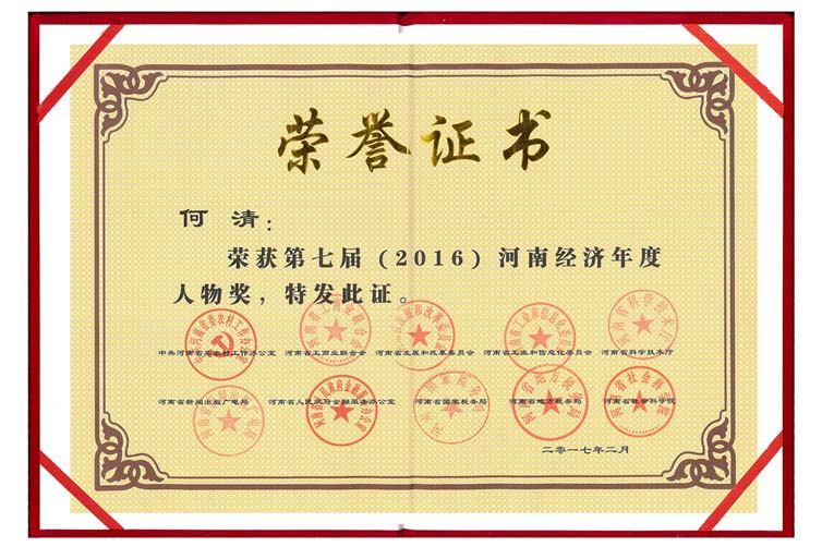 熱烈慶祝公司董事長(zhǎng)書記何清先生榮獲 第七屆(2016)"河南經(jīng)濟(jì)年度人物"