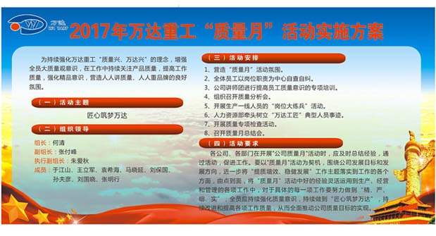 公司于2017年4月1號---4月30號舉辦以“匠心筑夢萬達”為主題的質量月活動。為持續(xù)強化萬達重工“質量興、萬達興”的理念,增強全員大質量觀意識,在工作中持續(xù)關注產品質量,提高工作質量,強化精品意識,營造人人講質量、人人重品牌的良好氛圍,增強企業(yè)凝聚力和市場競爭力。
