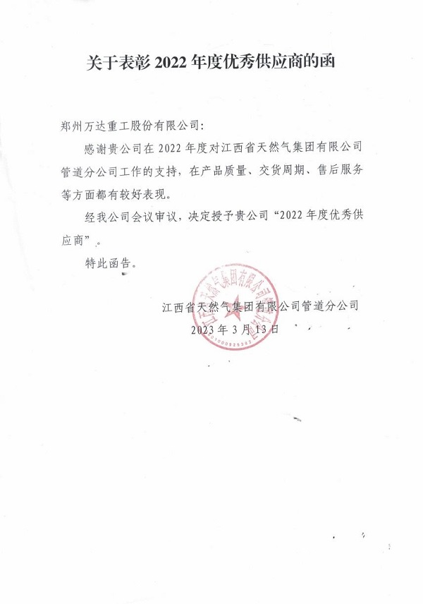 近日,鄭州萬達重工股份有限公司收到了江西省天然氣集團有限公司管道分公司頒發(fā)的2022年度“優(yōu)秀供應商”榮譽獎牌,獲得該公司2022年度優(yōu)秀供應商榮譽稱號。業(yè)主方對公司所承接彎管項目的產(chǎn)品質(zhì)量、交貨周期、售后服務等方面給予高度贊揚。