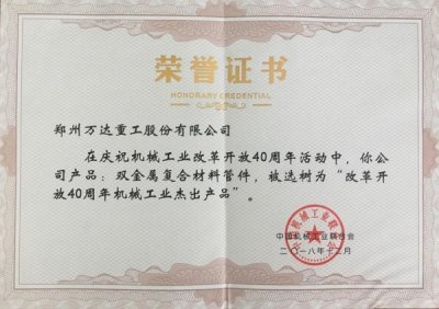 2019/03/06 614 改革開放40周年之際,在中國機械工業(yè)聯(lián)合會舉辦的機械工業(yè)杰出產(chǎn)品征集及宣傳活動中,鄭州萬達重工股份有限公司雙金屬復(fù)合材料管件被選樹為改革開放40周年機械工業(yè)杰出產(chǎn)品。 該項榮譽的取得,標志著我公司具有自主知識產(chǎn)權(quán)的雙金屬復(fù)合材料管件已經(jīng)能夠與當(dāng)今國內(nèi)外一流產(chǎn)品比肩,其具有的國際先進水平已經(jīng)得到用戶認可。