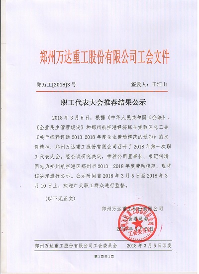 2018/03/08 3293 2018年3月5日,根據(jù)《中華人民共和國工會法》、《企業(yè)民主管理規(guī)定》和鄭州航空港經(jīng)濟(jì)綜合實驗區(qū)總工會《關(guān)于推薦評選2013-2018年度企業(yè)勞動模范的通知》的文件精神,鄭州萬達(dá)重工股份有限公司召開了2018年第一次職工代表大會。經(jīng)會議研究決定,推薦公司董事長、書記何清同志為鄭州航空港區(qū)鄭州市20132018年度勞動模...