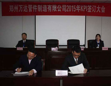2016/01/28 477 鄭州萬達管件制造有限公司2015年KPI簽訂會于1月30號在公司行政區(qū)會議室隆重舉行,公司班長以上所有管理人員參加了此次簽訂會議。簽訂會分為三級簽訂,即:董事長與總經(jīng)理簽訂、總經(jīng)理與公司各高管簽訂、公司各高管與分管的各部門負責人簽訂,近期,各部門負責人將部門的KPI指標進行分解,與各班組及相關(guān)崗位簽訂目標責任書,達到千...