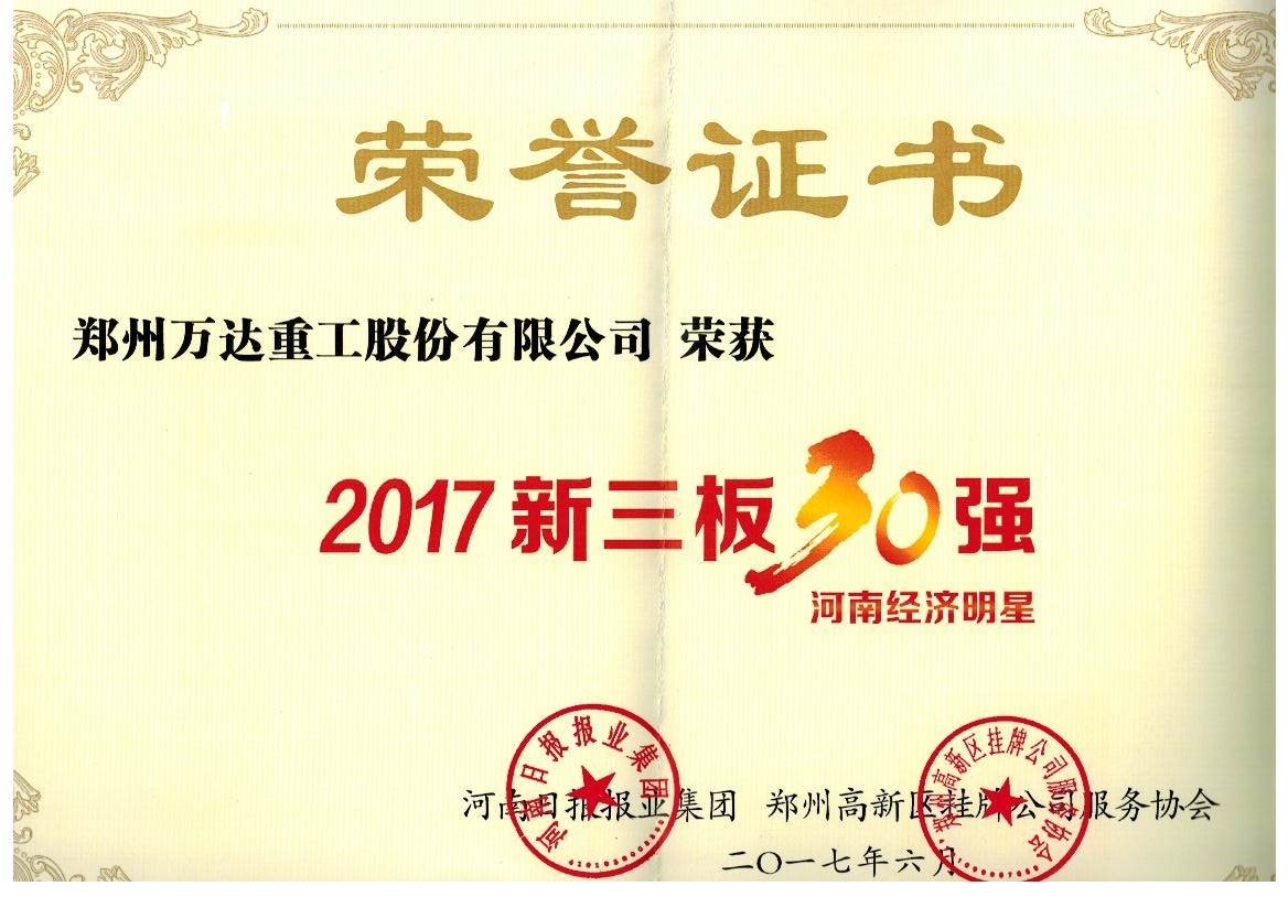熱烈祝賀鄭州萬達(dá)重工股份有限公司榮獲河南新三板“TOP30強(qiáng)”最具投資價值獎并獲得 “2017河南新三板30強(qiáng)”榮譽(yù)稱號。