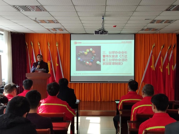 為豐富員工業(yè)余文化生活,共創(chuàng)幸福萬達(dá)事業(yè),在公司領(lǐng)導(dǎo)的大力支持下,在萬達(dá)重工工會辦的牽頭下,萬達(dá)重工臺球協(xié)會成立大會于2018年11月29日在公司二樓會議室隆重召開,萬達(dá)重工臺球協(xié)會全體成員參加了本次大會。公司袁總、馬總、劉總等公司高管前來表示祝賀。