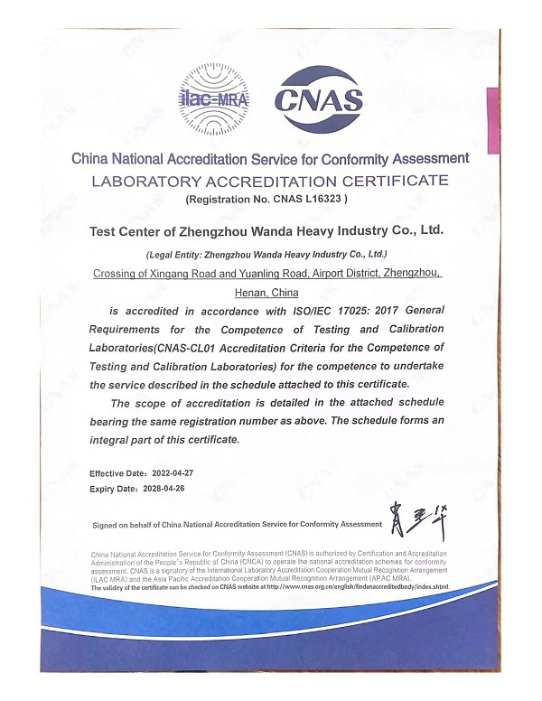 近日,鄭州萬達重工股份有限公司檢測中心順利通過中國合格評定國家認可委員會(以下簡稱CNAS)的審核,并獲得CNAS實驗室認可證書(注冊號L16323),這標志著萬達重工在實驗室建設、試驗及檢測能力和質量保障等方面取得了新的成果,代表著公司的技術能力和管理水平具備國際水準的規(guī)范性和公信力,提升了品牌影響力和企業(yè)的核心競爭力。