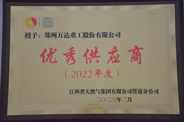 近日,鄭州萬達重工股份有限公司收到了江西省天然氣集團有限公司管道分公司頒發(fā)的2022年度“優(yōu)秀供應商”榮譽獎牌,獲得該公司2022年度優(yōu)秀供應商榮譽稱號。業(yè)主方對公司所承接彎管項目的產(chǎn)品質(zhì)量、交貨周期、售后服務等方面給予高度贊揚。